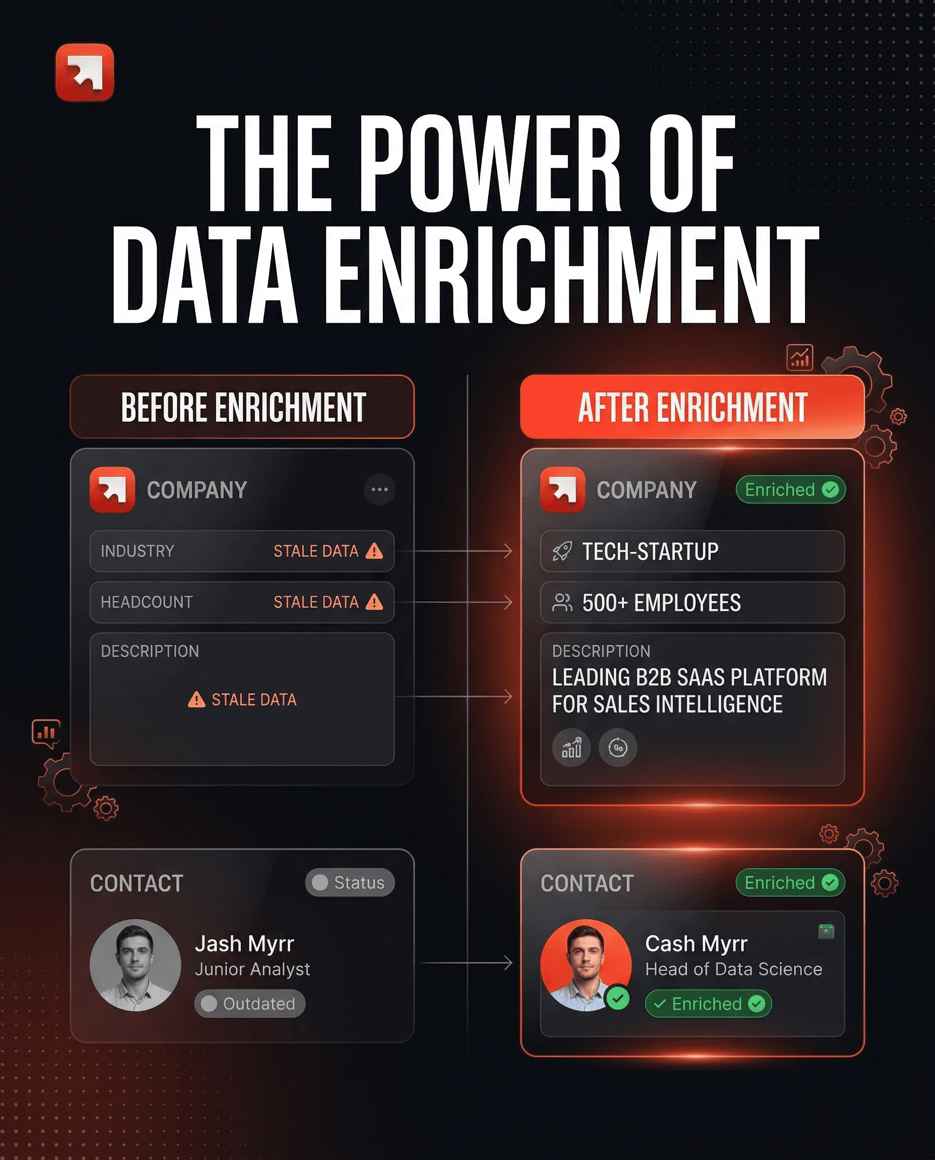 These intent signals transformed the CRM from a static address book into an early warning system for sales opportunities. Instead of reps discovering that a contact had left their company mid-call, the CRM told them before they picked up the phone and suggested what to do about it.