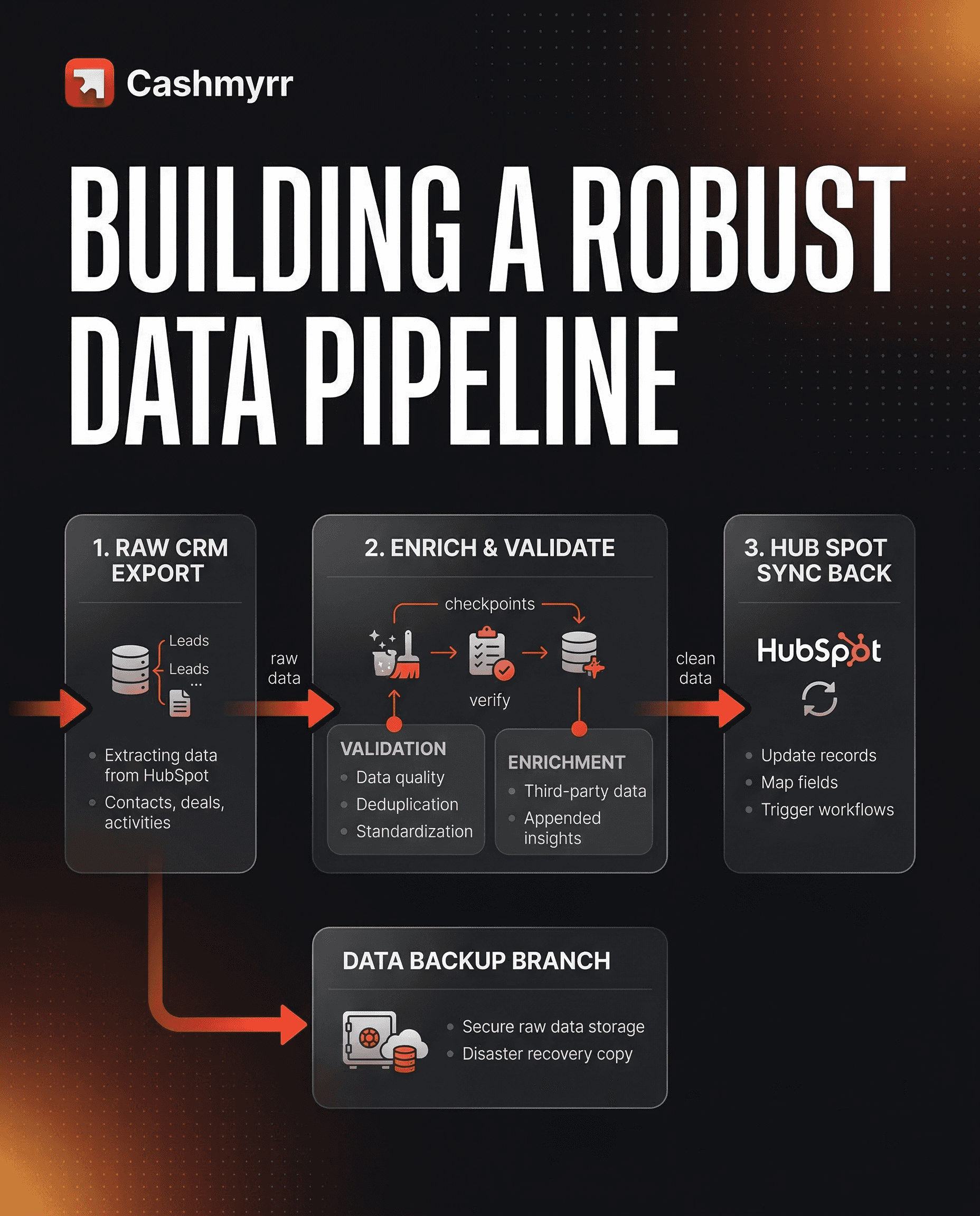 A full backup and audit trail: complete pre-cleaning data export with engagement history, documented property mapping, and a clear record of every cleaning and enrichment decision — replacing the undocumented freelancer work that came before.