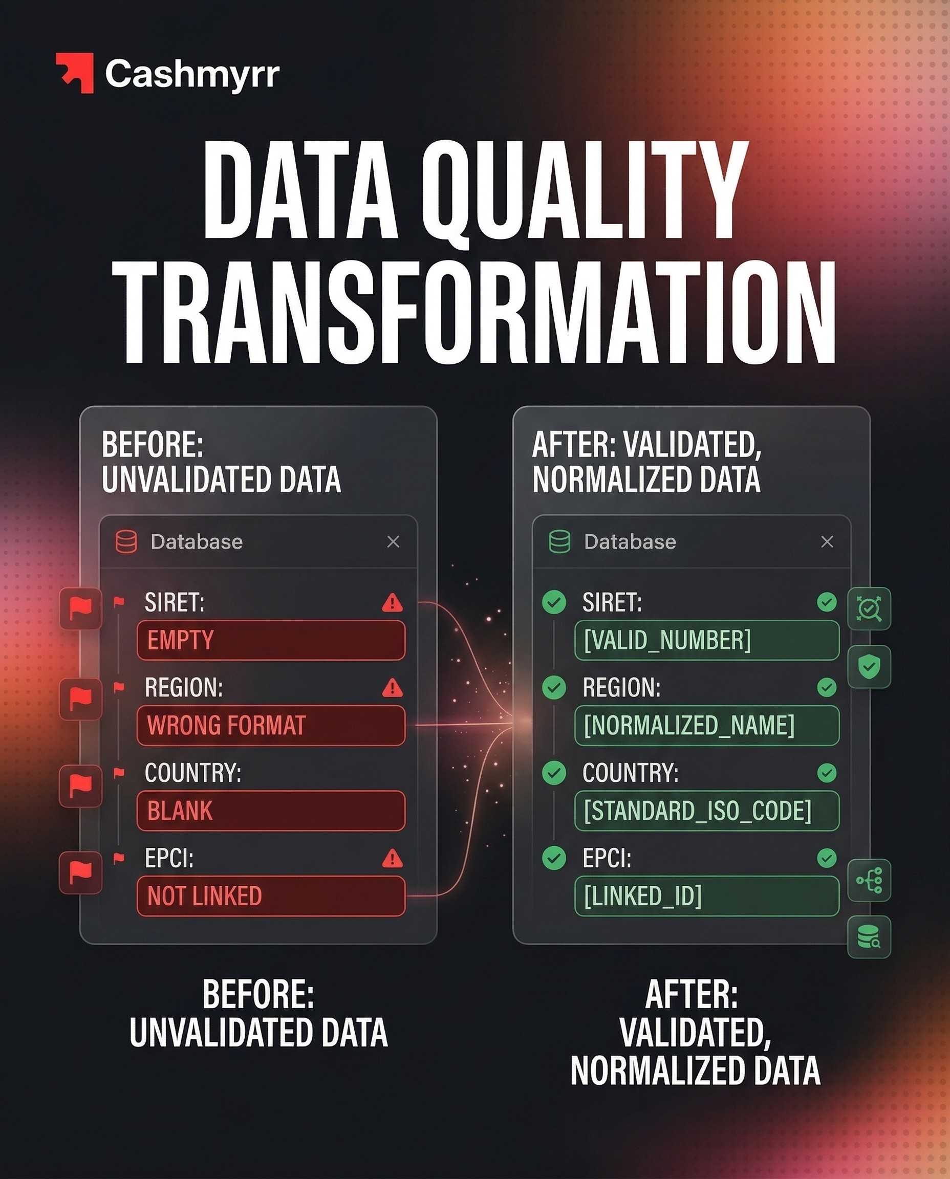 The headline problem: SIRET numbers were present on only 6% of records SIRET is the unique French business identifier, without it, you can't reliably deduplicate, match with third-party data, or comply with public procurement requirements. Region names were inconsistently formatted. 1K commune records had no country field. Almost 3K records had no usable identifier at all.