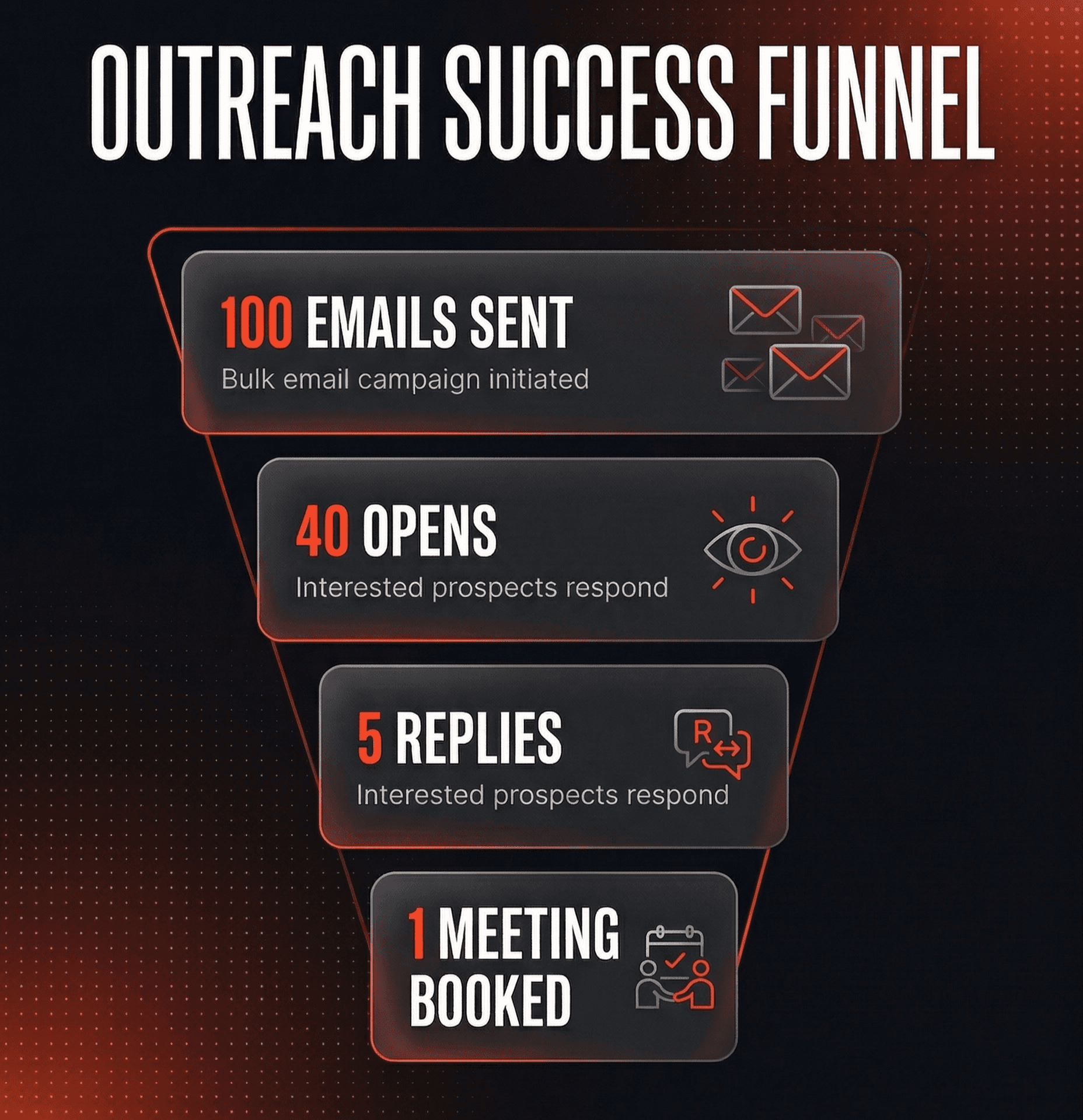 A typical B2B cold email funnel looks roughly like this: out of 100 emails sent, approximately 40 will be opened, 3 to 5 will get a reply, and about 1 will convert into a booked meeting. (LevelUp Leads, 2025)