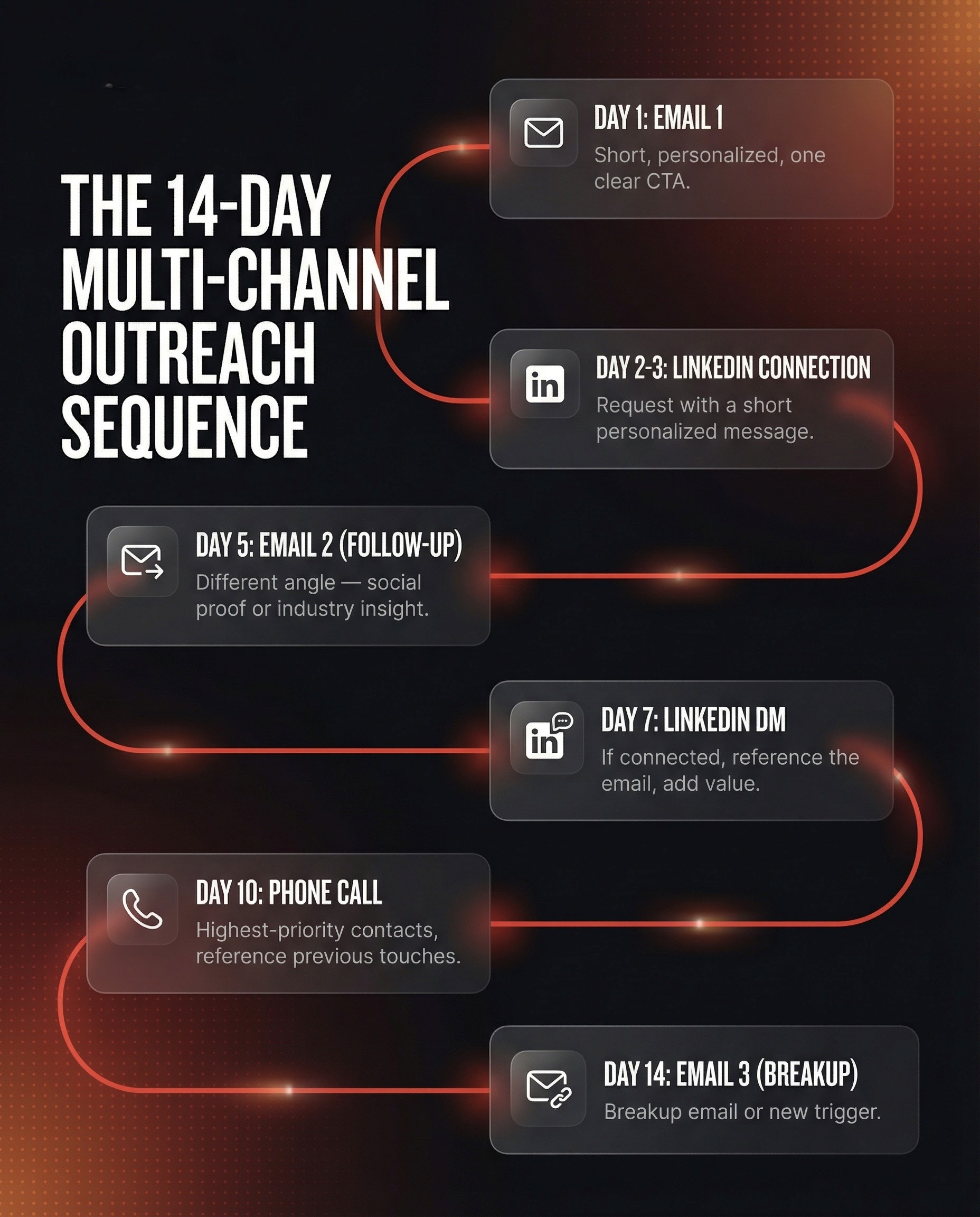 Outbound runs across email + LinkedIn + phone in a coordinated sequence, not as disconnected one-off blasts.